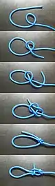 - последовательный способ завязывания концом — сделать колышку на коренном конце, вставить снизу ходовой конец в колышку, обнести коренной конец и вставить в колышку, затянуть[3];