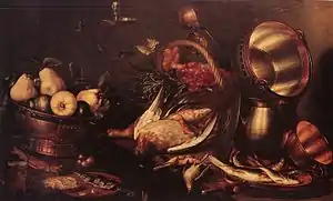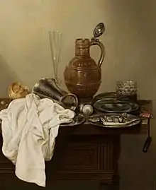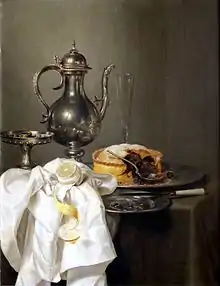 Наряду с цветочным натюрмортом в Голландии XVII века развивается и набирает всё большую популярность ещё одна разновидность натюрморта — изображение накрытых столов (в свою очередь подразделяющаяся на так называемые «банкеты» (нидерл. banketjes) и «завтраки» (нидерл. ontbijtjes))[21][22]. Родиной и центром этого вида натюрморта был Харлем. Предпосылкой его создания стало широкое распространение ещё в XVI веке портретов участников стрелковых гильдий во время банкета. Постепенно изображение накрытого стола стало самостоятельным жанром[23].