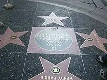 Но есть и два исключения к форме Звезды. Миссия Аполлона 11 на Луну, представлена установленной на Вайн-стрит[en] Звездой в форме Луны, которая содержит: имена астронавтов (Нил Армстронг, Эдвин E. Олдрин младший, Майкл Коллинз), дату первой посадки на Луну (20 июля 1969), и слова Apollo XI, — и выполнена из тёмно-серого терраццо, с телевизионной эмблемой.
