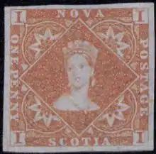 - Новая Шотландия — в мае 1860 года (одна марка с портретом в большом квадрате, поставленном на угол, была напечатана фирмой «Перкинс Бэкон»),