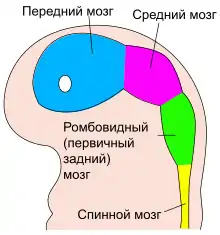 - Стадия трёх мозговых пузырей — у человека в начале четвёртой недели внутриутробного развития ростральный конец нервной трубки формирует три пузыря: Prosencephalon (передний мозг), Mesencephalon (средний мозг), Rhombencephalon (ромбовидный мозг, или первичный задний мозг).