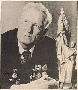 ![]() Василий Головцов с копией памятника | |