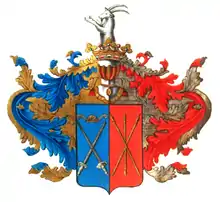 Щит разделён перпендикулярно на две части. В правой в голубом поле положены крестообразно две серебряных Шпаги (изм. польский герб Пелец) и над ними серебряная Шапка имеющая по сторонам перья. В левой части в красном поле три золотых Пики, обращённые остриями, как Шпаги, так и две Пики вверх, а третья Пика вниз (польские герб Елита).