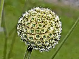 Цветы собраны в шаровые соцветия. Прицветники 6-7 мм в длину и от 3,5 до 4 мм шириной. Период цветения продолжается с июля по сентябрь.