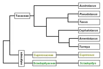 Однако, по результатам последних генетических исследований[2], следующие роды, обычно относящиеся к семейству тисовых, более близки к головчатым тисам и поэтому также должны быть включены в Cephalotaxaceae: