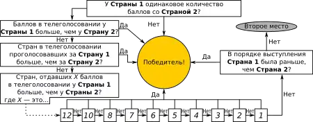 По обновлённым в 2016 году правилам в процедуре, иногда называемой «каунтбэк», если две (или более) страны получают одинаковое количество баллов, то победителем объявляется страна, получившая наибольшее количество баллов от телеголосования. Если между странами по-прежнему сохраняется равенство, то на втором этапе «тай-брейка» победитель определяется по наибольшему количеству проголосовавших стран в телеголосовании. Третий этап в случае равенства — подсчёт количества стран, давших 12 баллов каждой такой стране (также от телеголосования). Эта процедура продолжается с 10 баллами, 8, 7… и ведётся до тех пор, пока не будет определён победитель по результатам неравенства этих баллов. Если не удаётся определить победителя на втором этапе «тай-брейка» после того, как количество стран давших один балл оказалось равным, то победителем становится та страна, которая в порядке выступления исполнила песню первой. В тех случаях, когда телеголосование не может быть применено, то используется та же схема, но с баллами, данными от национальных жюри голосующих стран (100%-ное голосование жюри по различным причинам)[13]. Это правило изначально применялось только к первому месту немного в изменённом виде: на первом «этапе» тай-брейка высшее место отдавалось стране, которой отдали свои баллы бо́льшее количества стран; далее всё повторялось без разделения на баллы, полученные от телеголосования или жюри, то есть второй этап — наибольшее количество 12-бальных отценок и так далее[14]. C 2008 года это правило стало применяться ко всем местам[15].