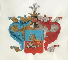 Щит разделён по горизонтали на две части. В верхней на голубом фоне изображён золотой лев с мечом, стоящий на серебряном змее, находящемся в нижней части щита на красном фоне. Щит увенчан обыкновенным дворянским шлемом под короной и тремя страусовыми перьями. Намёт на щите голубого и красного цвета с золотым и серебряным подбоем.