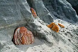 В голубой земле янтарь встречается кусками массой от нескольких миллиграммов до 5—6 кг, нигде не образуя сколько-нибудь больших скоплений. В янтароносных отложениях куски янтаря располагаются или плашмя (54 %) или с некоторым наклоном в ту или иную сторону. Содержание янтаря на отдельных горизонтах неодинаково[8].