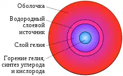 Со временем гелий в ядре исчерпывается. С какого-то момента реакции с его участием продолжаются только в оболочке ставшего инертным ядра, в результате чего звезда начинает расширяться и переходит на асимптотическую ветвь гигантов[5][7].