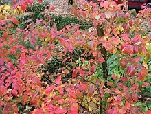 Листья простые, крупные, эллиптические или овальные, темно-зеленые, гладкие, блестящие, прилегающие, на коротких черешках, длиной до 8 см, шириной — 4 см, с цельными краями или зубчатые; молодые листья — ярко-зелёные, осенью листва приобретает алый цвет[3].