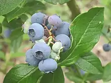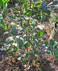 - Bluecrop. Среднего срока плодоношения, известен с 1952 года. Блюкроп является самым промышленно распространённым сортом в США. Считается эталоном для других сортов. Достигает высоты 1,6—1,9 метра. Побеги направлены вверх. Листья тёмно-зелёные, средней величины, продолговатые, на конце заострённые. Грозди длинные. Ягоды крупные, 17—20 миллиметров в диаметре, слегка сплющены, синие, с сильным светло-голубым налётом, упругие, вкусные, собраны в небольшие свободные кисти. Созревание ягод: конец июля — август, созревание ягод неодновременное, плодоношение очень обильное, регулярное, урожайность 6—9 кг с куста. Ягоды не растрескиваются, хорошо хранятся и транспортируются. Вкус очень хороший, терпкий. Ягоды могут быть кисловатыми и иметь большую долю красных «попок» при слишком раннем сборе или слишком большом количестве ягод на кусте. Сорт отличается устойчивостью к болезням, зимостоек и относительно засухоустойчив. Отличается хорошей зимостойкостью. Морозоустойчивость до минус 34 °C (по польским данным), до минус 29—35 °C (по американским данным), цветки выдерживают понижения температуры до −7 °C. Один из самых ценных сортов голубики, подходит как для любительского выращивания, так и для промышленного выращивания. Для улучшения плодоношения рекомендуется сильная обрезка[14][15].