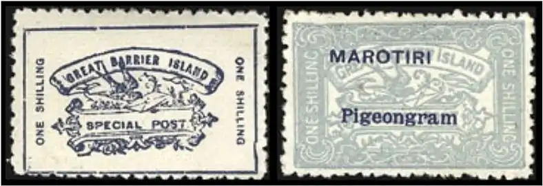 С 1898 по 1908 год выпускались почтовые марки голубеграммы, которые можно рассматривать в качестве первых в мире знаков воздушной почты[6]. Первая специальная почтовая марка для голубиной почты по линии Окленд — Грейт-Барриер была выпущена тиражом 1800 экземпляров. В 1899 году для связи в этом же направлении появились треугольные марки двух номиналов: синяя — 6 пенсов и красная — 1 шиллинг, а для сообщения с архипелагом Маротири компанией одноимённого синдиката была выпущена собственная почтовая марка.