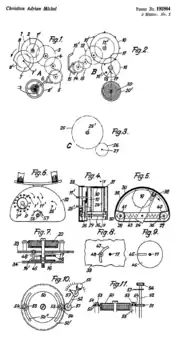 Примерно в то же время разработкой голубиной камеры занимался швейцарский часовщик из Шмидрюда Христиан Адриан Мишель (1912—1980)[33]. В 1931 году он был назначен в службу голубиной почты швейцарской армии, а в 1933 году начал работать над адаптацией голубиной фотокамеры Нойброннера под 16 мм плёнку, улучшением механизма контроля задержки перед первым снимком и перемоткой плёнки между кадрами. Камера Мишеля, запатентованная в 1937 году в Швейцарии[34], Германии[35], Франции[36], Бельгии[37] и Великобритании[38], весила всего 70 граммов и, возможно, была первой камерой с таймером, управляемым часовым механизмом[39].