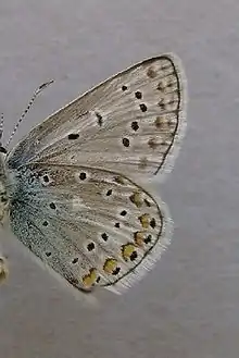 Размах крыльев 23—28 мм. Крылья самцов на верхней стороне голубые с нешироким темным краем. На заднем крыле к темной окантовке примыкает ряд черноватых пятен. Жилки к вершинам крыла чернеют. Самка с коричневой окраской верхней стороны крыльев и с желто-оранжевыми прикраевыми пятнами на крыльях. Нижняя сторона крыльев самцов светло-серая с бледным рисунком. Прикорневая область с сизовато-голубым напылением. На фоне задних крыльев выделяются два беловатых пятна — треугольной формы у вершины центральной ячейки и размытое лучистое у прикраевой перевязи. Нижняя сторона крыльев самки окрашена темнее.