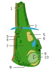 Площадка для гольфа состоит из серии лунок, каждая из которых имеет свою стартовую площадку (англ. Teeing ground). Стартовая площадка отмечается двумя метками, показывающими допустимые границы зоны, где может быть установлен колышек для мяча (англ. Tee). Также частью площадки являются гладкое поле и неровное поле (Fairway and rough (англ.)) и прочие препятствия (англ. Hazard (golf)). Финальной частью площадки является лунка, которая, для возможности ориентирования, помечается каким-либо образом (чаще флажком). Лунка располагается на специальной лужайке «грин» (Putting green (англ.)), где высота травы минимальна. В прочих местах высота травы может быть самой различной для того, чтобы затруднить прохождение площадки.