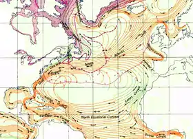 Гольфстри́м (от англ. gulf stream — течение из залива) — тёплое морское течение в Атлантическом океане. В узком смысле Гольфстримом называют течение вдоль восточного побережья Северной Америки от Флоридского пролива до Ньюфаундлендской банки (так оно, в частности, отмечается на географических картах). В широком смысле Гольфстримом часто называют систему тёплых течений в северной части Атлантического океана от Флориды до Скандинавского полуострова, Шпицбергена, Баренцева моря и Северного Ледовитого океана[1]. Температура у поверхности составляет +25… +26 °C, на глубине 400 м +10… +12 °C[1]. Длина течения вплоть до Шпицбергена составляет около 10 000 км[2].