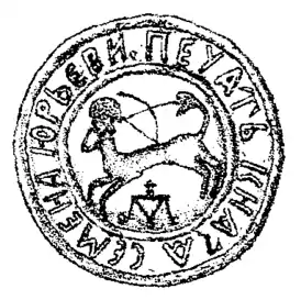 ![]() Печать князя Семёна Гольшанского с изображением родового герба Гольшанских Гипоцентавра, прорисовка конца XIX века | |