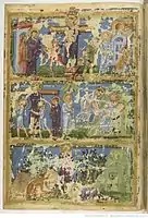 наверху: пророк Даниил во рву с львами, Три отрока в пещи огненной; внизу: царь Манассия, пророк Исайя и царь Езекия