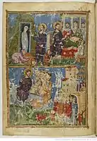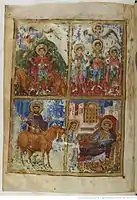 наверху: Благовещение, Встреча Девы Марии с праведной Елизаветою; внизу: Бегство пророка Ионы и его проповедь в Ниневии.