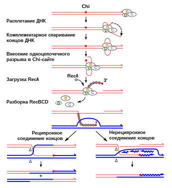 Фермент RecBCD, состоящий из трёх субъединиц, инициирует рекомбинацию путём связывания с тупым или почти тупым концом ДНК-дуплекса (тупым называется конец, где ни одна из двух цепей не выступает за пределы молекулы). Дальше субъединицы RecB и RecD, имеющие геликазную активность, расплетают дуплекс, а RecB при этом может функционировать ещё и как нуклеаза. Дуплекс расплетается вплоть до того момента, когда RecBCD сталкивается с определённой нуклеотидной последовательностью (5'-GCTGGTGG-3'), известной как Chi-сайт[55].