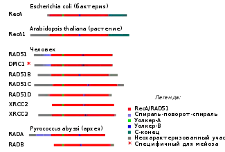 Семейство белков рекомбиназы RecA обнаруживается почти во всех организмах: RecA у бактерий, Rad51 и DMC1 у эукариот, RadA у архей и UvsX у фага T4[92]. Во всех трех доменах прослеживаются родственные белки, связывающие одноцепочечную ДНК, которые играют роль в рекомбинации и многих других процессах[93]; Rad54, Mre11, Rad50 и ряд других белков также найдены у архей и эукариот[91][92][94].
