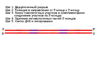 Известно два основных механизма гомологичной рекомбинации: путь репарации двуцепочечных разрывов (DSBR-путь), также известный как модель двойной структуры Холлидея, и путь синтезозависимого отжига цепи (SDSA-путь)[33]. Оба начинаются одинаковым образом. Когда двуцепочечный разрыв в цепи обнаружен, белковый комплекс MRX (у человека MRN) встает по обе стороны от разрыва, после чего следует отрезание 5'-концов, проходящее в два отдельных этапа. Первый этап заключается в том, что MRX в паре с белком Sae2 вырезают 5'-концы цепи около разрыва, тем самым оставляя выступающие 3'-концы. Второй этап 5' → 3'-отрезания продолжает геликаза Sgs1 и нуклеазы Exo1 и Dna2. Sgs1 «расстёгивает» двойную спираль, а Exo1 и Dna2 создают разрывы в одноцепочечной ДНК, высвобожденной Sgs1[27].