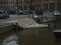 Три ориентира памятника на городские исторические места призваны дополнительно подчеркнуть тот фон, в котором существует сам мемориал и его символика. Табличка, размещенная на ограде канала с обеих сторон (так чтобы было видно и с суши, и с воды) содержит надпись на трех языках (нидерландском, английском и французском):