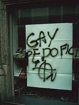 Данная тематика также активно дискутировалась активистами гей-освободительного движения[120]. Радикальное гей-освободительного движение зародилось в 1970-е годы в США на стыке гомофильного движения и движений «новых левых». Лишь немногие гей-освободительные группы сохранились к концу 1970-х — началу 1980-х годов в США, однако некоторые из их идей и риторики, включая взгляды на педофилию, оставались ещё живы в некоторых кругах, хотя и дискуссии стали менее резонансным с течением времени. Важно отметить, что идеи «гей-освобождения» достигли многие страны сравнительно позже или продержались там дольше (например, Франция, Испания). В других же странах (Бельгия) они вовсе не оказали большого влияния на развитие национального ЛГБТ-движения[117].