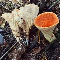 - Gomphus bonarii ярко-красной окраски с молочно-белыми складками гименофора.