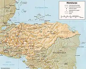 Респу́блика Гондура́с (исп. República de Honduras [reˈpuβlika ðe onˈduɾas]) — государство в Центральной Америке. Столица — город Тегусигальпа (до 1880 года — Комаягуа). Страна была также известна в прошлом как Испанский Гондурас, для отличия от Британского Гондураса, который впоследствии стал государством Белиз[6]. Граничит с Никарагуа на юго-востоке, Сальвадором на юго-западе и Гватемалой на западе. Омывается Карибским морем на севере и Тихим океаном (залив Фонсека) на юге.