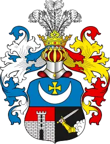 Щит разделён горизонтально надвое, в верхней половине в голубом поле изображён золотой крест и под ним серебряный полумесяц, рогами обращённый вверх (польский герб Лелива). В нижней половине в правом красном поле находится серебряная крепость с башнею. В левом чёрном поле видна рука, из облака выходящая в золотых латах, с поднятым вверх мечом (польский герб Малая Погоня).
