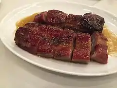 Важнейшим компонентом кантонской кухни является жареная свинина, которую продают в специальных магазинах-гриль сиумэй, вывешивая в витрине на крюках. Двумя столпами считаются чашао и сиуюк. Для приготовления чашао (часиу) используют в основном корейку, грудинку, шпик и шею. Маринованную в специях, соусах, мёде, мальтозе или вине свинину накалывают на длинную вилку и помещают в печь до появления характерной тёмно-красной корочки. Сиуюк ещё называют жареной свининой с пятью слоями: верхний слой составляет хрустящая корочка, затем идут слои сала и сыроватого мяса, а в основании — солёно-пряный слой[100][101][102].