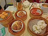 Начинка кантонских шаомай (сиумай) состоит из свиного фарша, мелких креветок, чёрных грибов, зелёного лука, имбиря и приправ (смесь рисового вина, соевого соуса, кунжутного масла и куриного бульона), в разных вариациях добавляют также молодые побеги бамбука, водяные орехи и перец. Внешняя оболочка сделана из тонкого теста, а открытый верх украшен крабовой икрой, морковью либо зелёной горошиной. В качестве уличной еды популярны сиумай с рыбной пастой и рыбные шарики с карри, подаваемые со сладким соевым соусом и маслом чили[85][86]. Часто вместе с сиумай подают хакау — прозрачные и гладкие димсамы с креветками, побегами бамбука и луком[87][88].