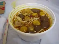 Лапша быстрого приготовления под брендом «Doll Noodles» появилась в Гонконге в конце 1960-х годов, а в 1980-х годах местного производителя поглотила японская группа Nissin Foods[117]. Несмотря на появление и других торговых марок, за лапшой быстрого приготовления в Гонконге надолго закрепилось название «кукольная лапша». Повседневной едой считаются супы с яичной лапшой. Однако в дорогих ресторанах к яичной лапше добавляют вонтоны, рыбу, креветок, солёную икру креветок или другие морепродукты. Повсюду готовят наваристые супы из рыбы и морепродуктов, а также из свиных потрохов и костей с различными специями. В недорогих уличных закусочных готовят говяжьи потроха — желудки, кишки и лёгкие. Предварительно маринованные потроха тушат в больших чанах и подают с жидкой горчицей и сладким соусом[78][118].