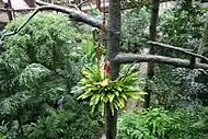 Авиарий имени Эдварда Юда, расположенный в южной части Гонконгского парка, разбит вдоль естественной речной долины на восточном склоне пика Виктория. Среди деревьев, высаженных в птичьем вольере, — инжир (Ficus carica), хлопчатник древовидный (Gossypium arboreum), бомбакс капоковый (Bombax ceiba), лумбанг (Aleurites moluccana) и несколько видов пальм. Важную для птиц лесную подстилку составляют опавшие листья деревьев, папоротников и почвопокровных растений. В климатических условиях Гонконга гигантские деревья, характерные для влажных тропических лесов, едва ли могут достичь зрелости, поэтому в авиарии они играют роль скорее имитации привычной птицам экосистемы[13].