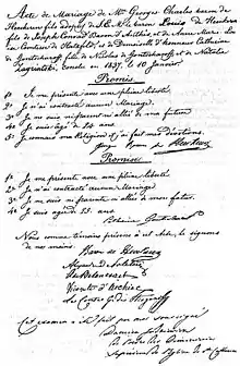 Дантес не ездил в дом невесты, Екатерина Николаевна виделась с ним только у своей тётки, фрейлины Загряжской. Свадьба состоялась 10 января 1837 года. Загряжская прилагала все усилия, чтобы церемония прошла как можно более в узком кругу: так, она настояла, «опасаясь излишнего любопытства»[32], чтобы Софья Карамзина (в свете её считали женщиной злоязычной), приглашённая сёстрами, не присутствовала на церемонии. Карамзина очень сожалела, что лишилась возможности увидеть «как выглядели участники этой таинственной драмы в заключительной сцене эпилога»[33].