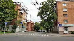 | справа дом № 32/77, слева № 37/79 (Главное управление статистики) — вид со стороны перекрестка с улицей Коцюбинского | слева 3-х этажное здание Академии (№ 34) — вид со стороны перекрестка с улицей Коцюбинского | справа одноэтажный дом № 48 — вид в направлении перекрестка с улицей Чернышевского | слева одноэтажные дома № 69 и 67, справа № 62 — вид со стороны перекрестка с Киевской улицей |