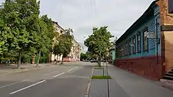 | начало улицы — слева одноэтажный дом № 11 — вид в направлении перекрестка с Святониколаевской улицей | слева одноэтажный дом № 13/13 — перекресток с улицей Родимцева | справа одноэтажный дом № 22/8 — вид в направлении перекрестка с улицей Шевченко | слева 2-этажный дом № 25 (бывшая Торговая школа) — вид со стороны перекрестка с улицей Гетмана Полуботка |