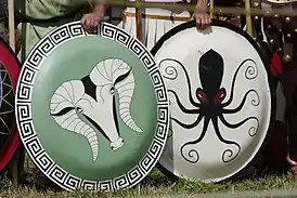 Диаметр гоплона варьировался от 80 см до 1 метра; щит прикрывал воина от подбородка до колен. Этот тип щита появился, предположительно, в VIII веке до н. э., о чём свидетельствуют изображения на керамике того времени.