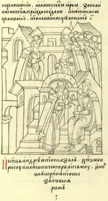 ![]() Андрей Шуйский сообщает о предложении службы от князя Юрия Ивановича Дмитровского Борису, Борис рассказывает об этом думе | |