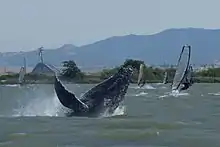 Горбатые киты нередко бьют и хлопают по поверхности моря длинными грудными плавниками и хвостовым плавником, взбивая пену, перекатываются на спине, выставляют из воды морды. Часто полностью выпрыгивают из воды в вертикальном положении и с оглушительным всплеском падают вниз (предположительно, таким образом горбатые киты сбрасывают с себя экзопаразитов-обрастателей). Подобное поведение фиксируется во все времена года, как у одиноких особей, так и у китов, собравшихся в группу; его точное назначение неизвестно[5].