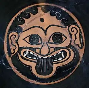 Историки отмечают в чернофигурной ранней аттической вазописи родство горгонейонов с изображением оргиастического бога Диониса, который единственный из всех олимпийцев изображался в анфас. Порой Медуза «бородата», отчего становится трудноотличимой от самого Диониса[10][11] (на самом деле подчас это не борода, а потоки крови, льющиеся из отсечённой шеи).