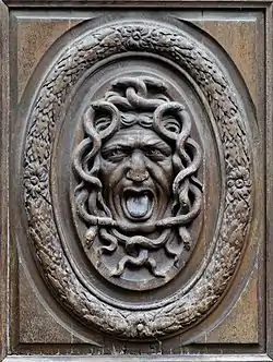 Голова Медузы в период классицизма и ампира, воскресившего античные мотивы, в том числе и этот, стала традиционным декоративным элементом, сопутствующим военной арматуре в украшении зданий и оград. К примеру, она является очень часто встречающимся мотивом в чугунном и кованном декоре Санкт-Петербурга[14], красуясь, в частности, на ограде 1-го Инженерного моста и решётке Летнего сада со стороны Мойки. Горгонейон можно встретить как в архитектуре этой эпохи, так и в отделке мебели и холодного оружия, например, на эфесах шпаг.