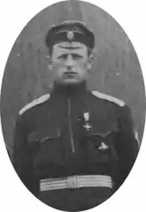 За то, что будучи начальником команды разведчиков 27 мая 1915 года в бою у д. Жджарки, обнаружил внезапное наступление противника, быстро занял передовой оборонительный окоп и удержал его до подхода поддержки и в это время около часу оборонялся от наседавшего в значительно больших силах противника; оценив важное значение своей позиции, он, по личной инициативе, выбрав удобный момент, во главе своих 16-ти разведчиков бросился на «ура» на значительно превосходящего противника и, обратив его в бегство, захватил 17 пленных.