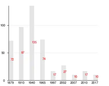 Число жителей по семейным спискам 1879 г.: 29 м. п., 43 ж. п.; по приходским сведениям 1879 г.: 24 м. п., 35 ж. п.[3]