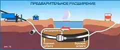 Расширение скважины осуществляется после завершения пилотного бурения. Буровая головка отсоединяется от буровых штанг и вместо неё присоединяется риммер — расширитель обратного действия. Приложением тягового усилия с одновременным вращением риммер протягивается через створ скважины в направлении буровой установки, расширяя пилотную скважину до необходимого для протаскивания трубопровода диаметра. Для обеспечения беспрепятственного протягивания трубопровода через расширенную скважину её диаметр на 50-100 % превышает диаметр трубопровода.