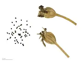Плод — продолговато-обратнояйцевидная коробочка до 1,5 см в диаметре, раскрывающаяся пятью створками. Семена фасолевидные, серо-коричневые.