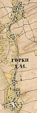 На карте Ф. Ф. Шуберта 1844 года обозначена деревня Горки и смежная с ней вторая деревня Горки, расположенная южнее, состоящая из 22 крестьянских дворов[11].