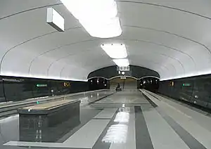 Путевые и торцевые стены перронного зала облицованы полированным зелёным мрамором «Индиана Грин». Пол платформы (а также вестибюлей) выполнен плитами из полированного гранита «Мансуровский» с включением гранита «Старобабанский» по специальному рисунку. Арочный потолок перронного зала окрашен в белый цвет по технологии Tex-Color.
