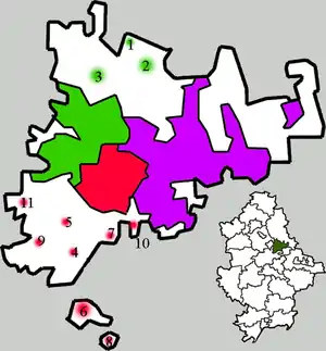 - с подчинёнными посёлками — 214 777 чел., в том числе: г. Комсомольск (29 097), г. Калининск (19 336), г. Никитовка (14 047), пгт Румянцево (9 660), пгт Кондратьевский (8 145), пгт Железная Балка (1 028)